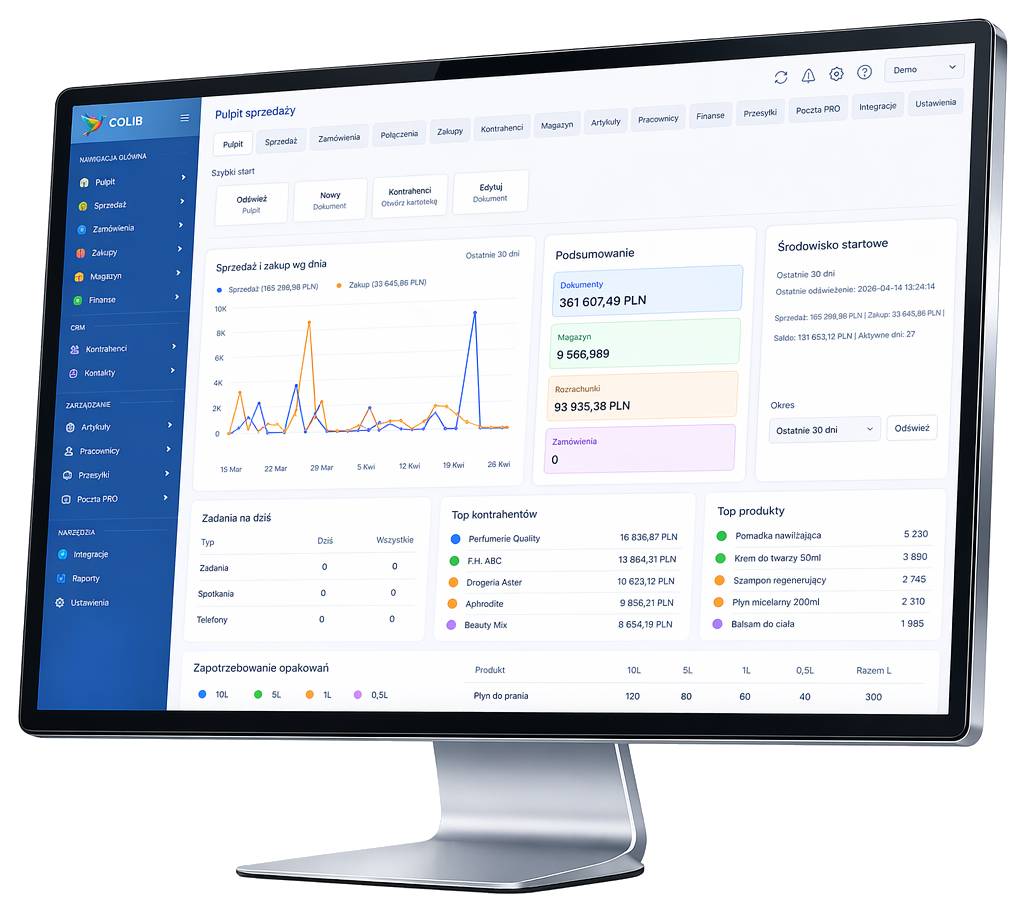 COLIB pomaga firmom, które wyrastają z prostych narzędzi i chcą spiąć dokument, towar, zamówienie i rozliczenie w jednym środowisku pracy.